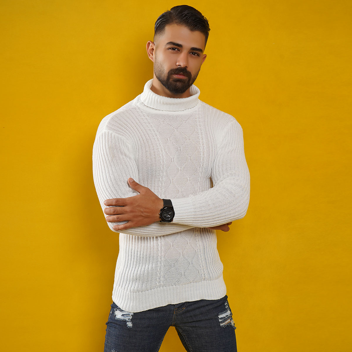 پلیوربافت مردانه سفید یقه اسکی مدل Hakan