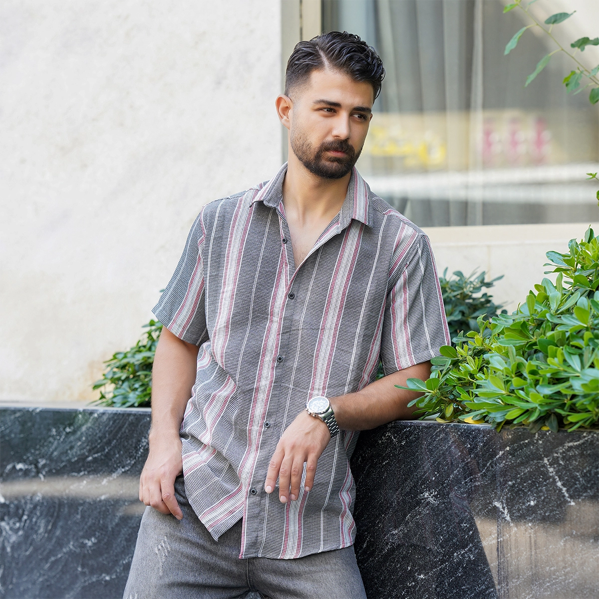 پیراهن راه راه طوسی قرمزطرح کنفی مردانه مدل Dara